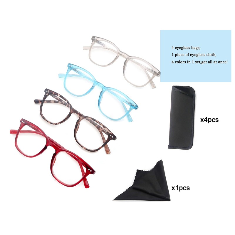 - 【Value package】4 pairs of the reading glasses + 4 pcs of soft cases + 1 pc of cleaning cloth those are convenient for you to put the readers glasses in different places and you can always have a pair handy.