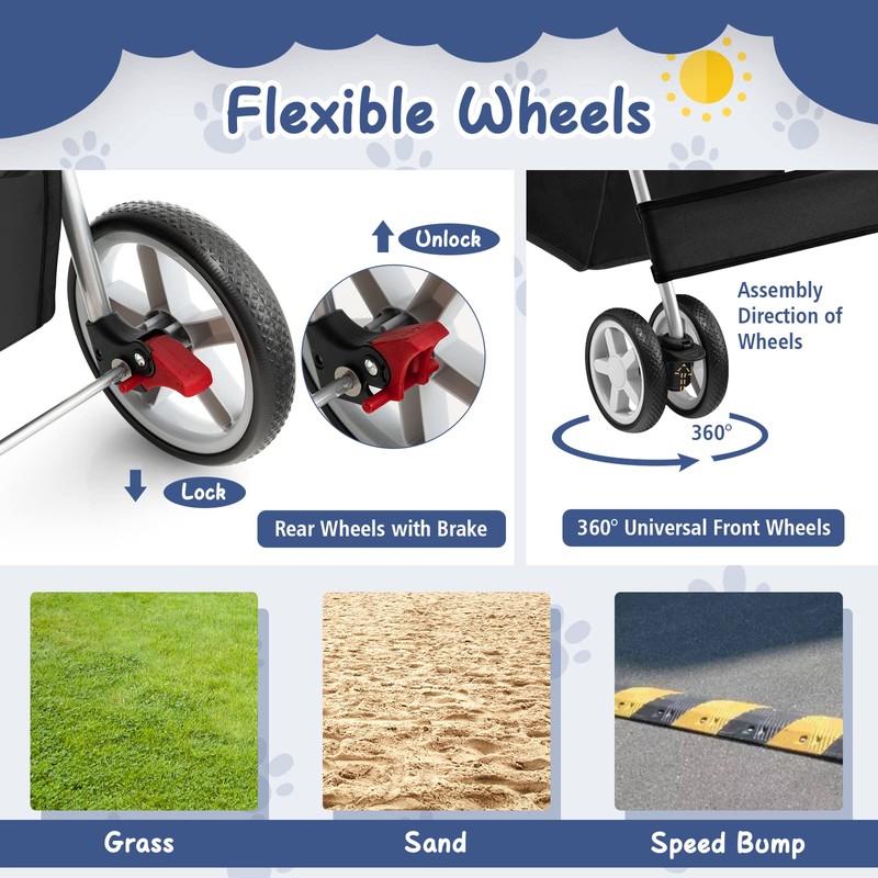 🚶♂️ All-terrain Traveling Smoothly. Front wheel universal shock absorbers, flexible steering, adapt to a variety of road conditions; rear wheel brakes, easy to lock, stable control. Whether it's a flat street or a rugged trail, this pet travel stroller can travel smoothly.