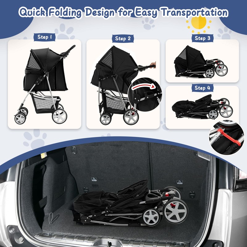 🌟 Convenient & Foldable. Easy to operate with one hand, one key to close this dog stroller, instantly become smaller, the folded size is perfectly adapted to the trunk of the car, no matter whether it is a daily trip or long-distance travel, does not take up space, super convenient to carry!