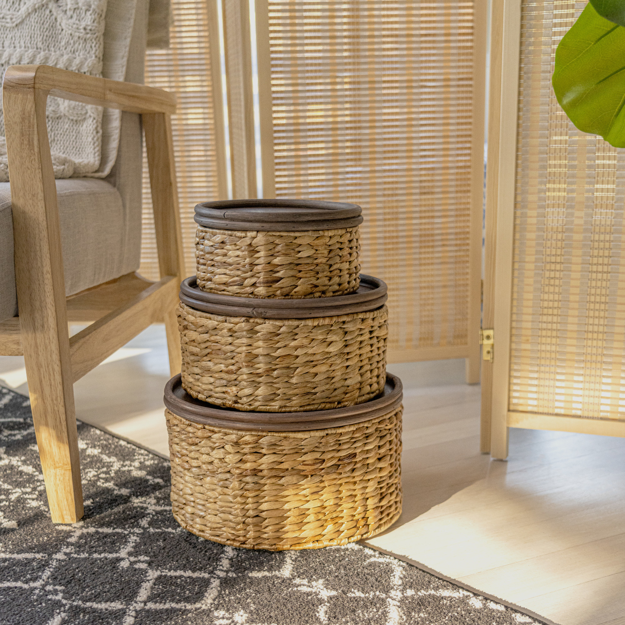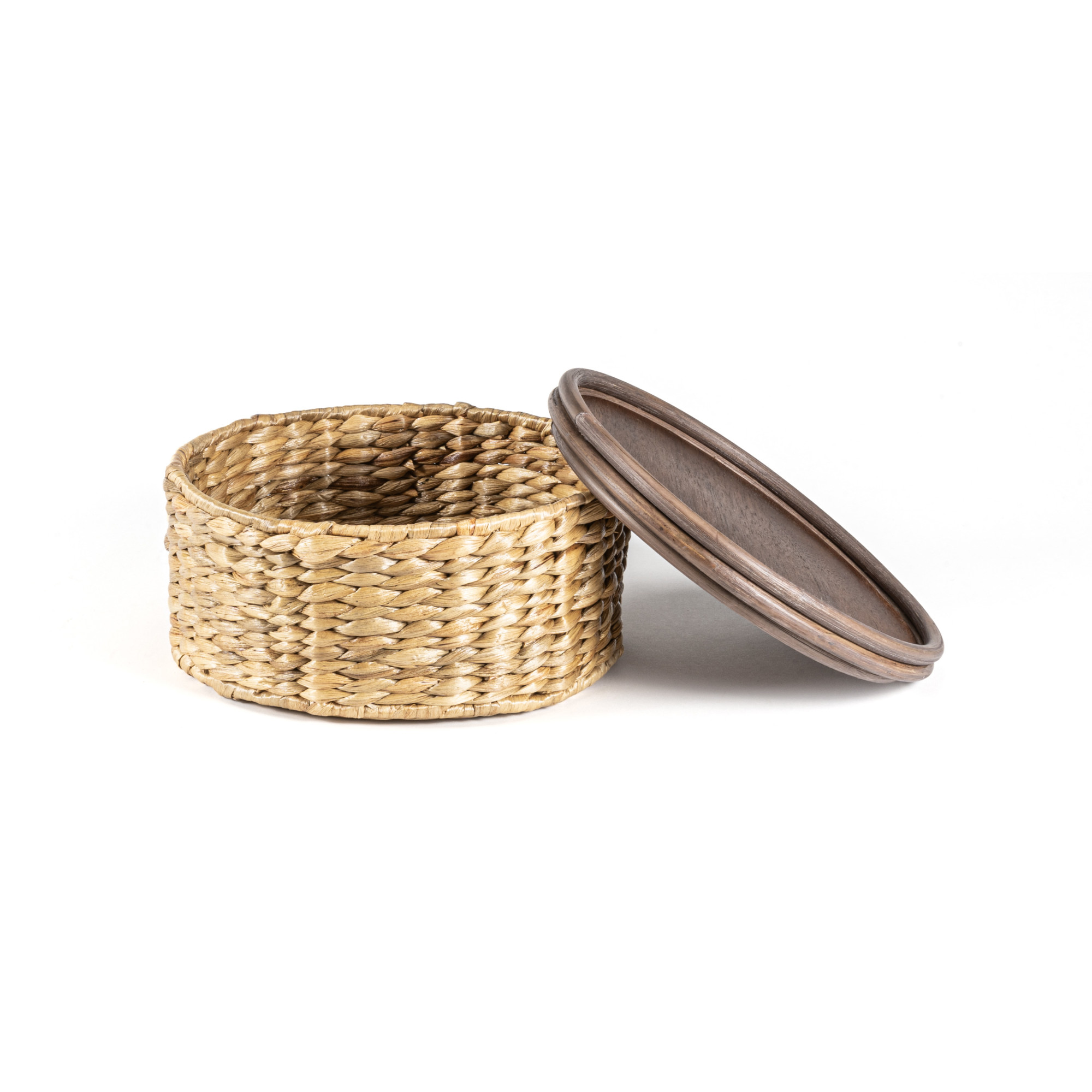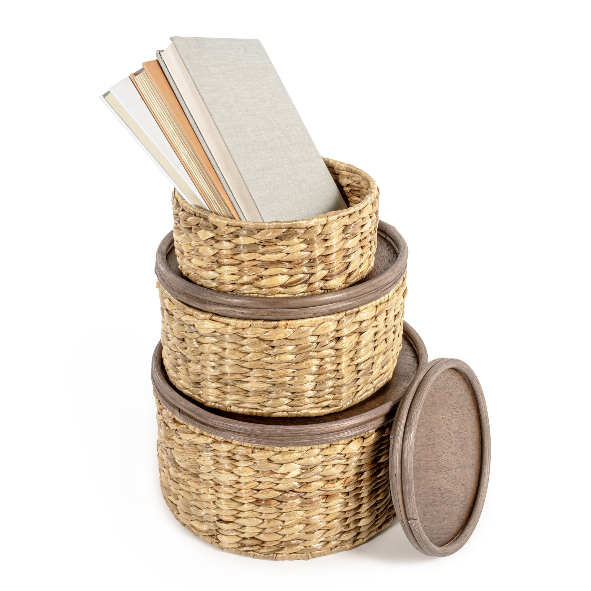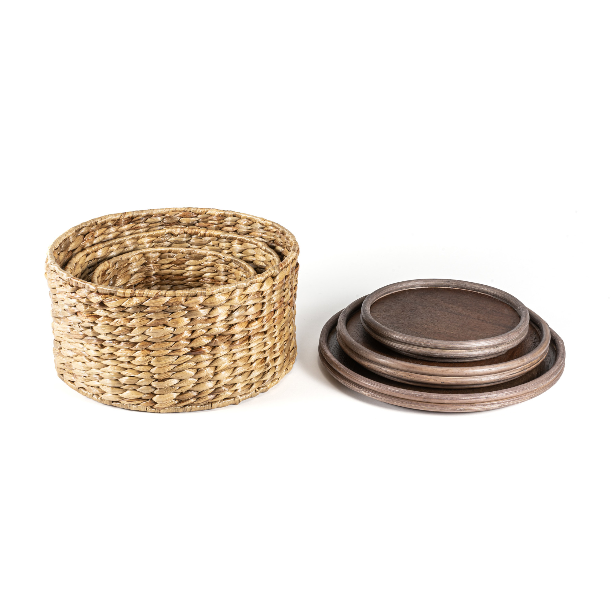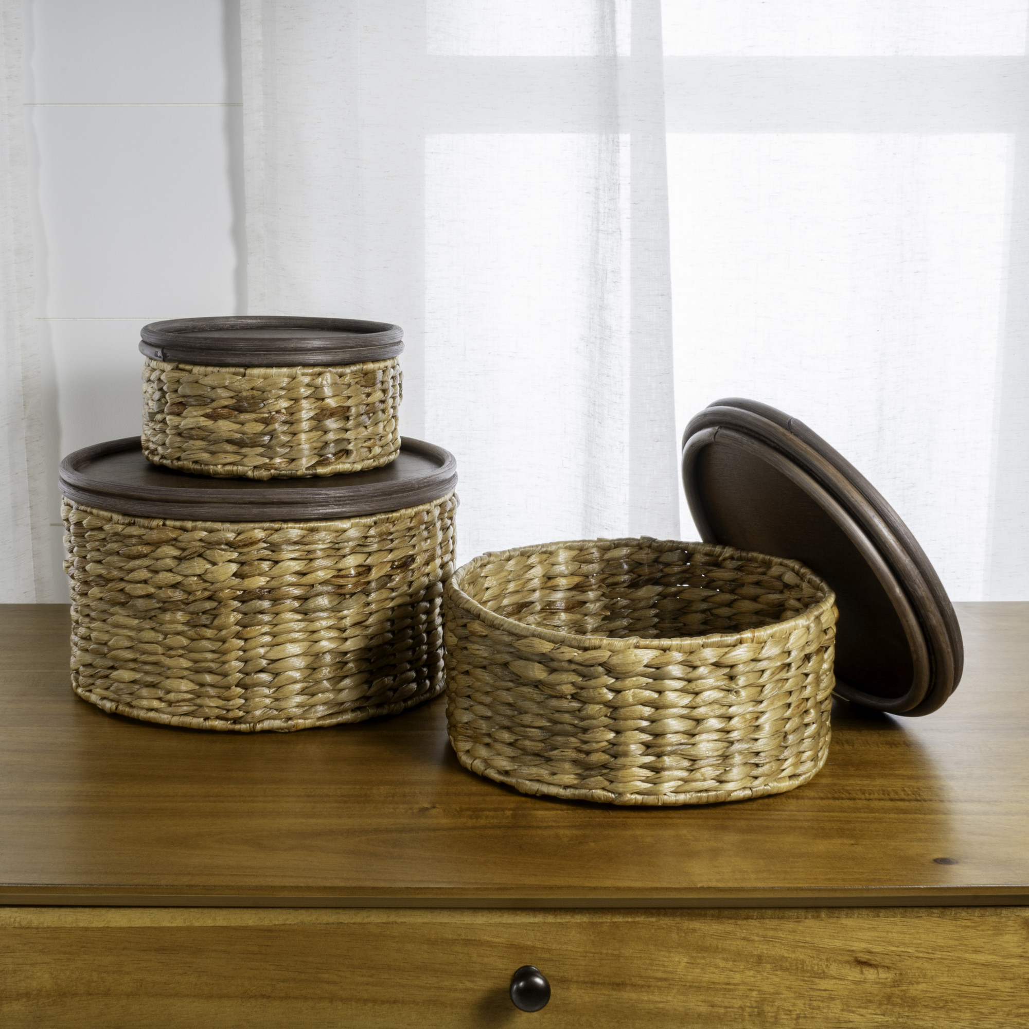 - Three circular wooden baskets of various sizes, each with their own removable lid