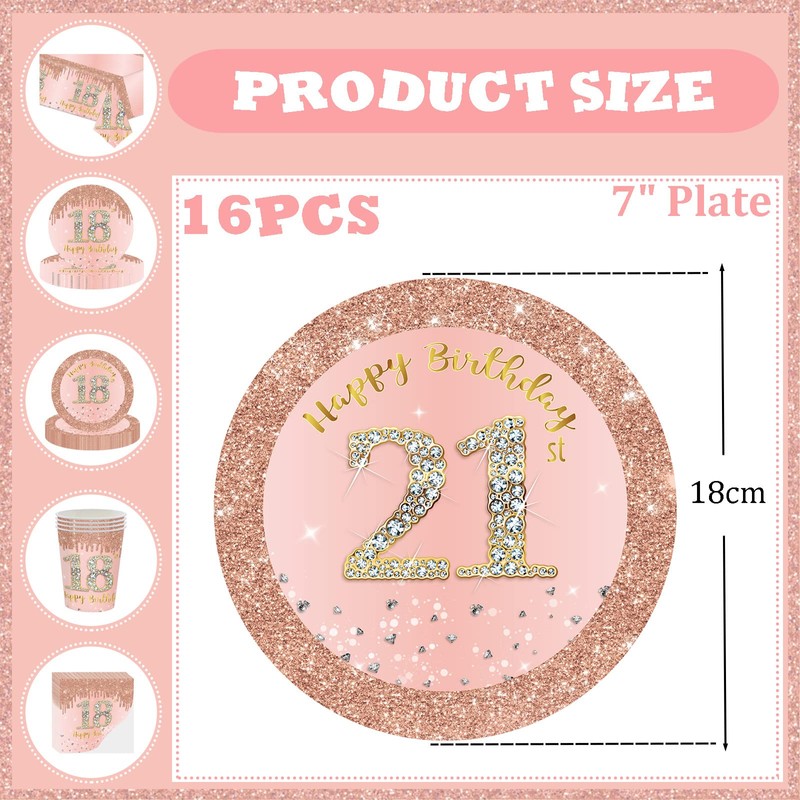 Happy 21st Birthday Paper Plates 7" Rose Gold,16Pcs Girls Birthday Party Plates Tableware,21st Birthday Decorations Plates for Girls,Women,Her 21st Birthday Party Supplies Table Decorations