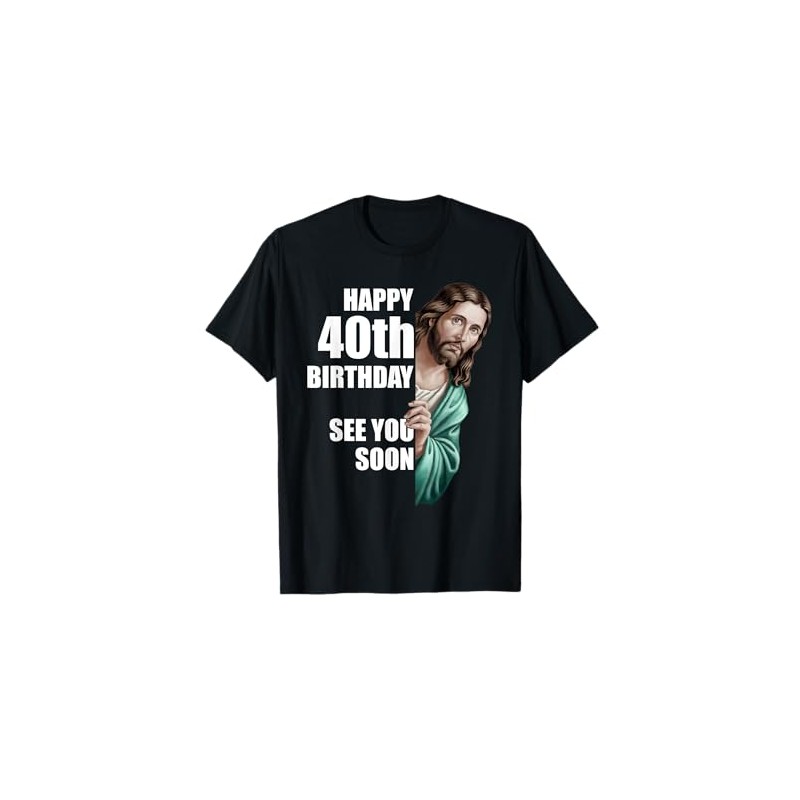 - This design shows a Jesus-like figure peeking around a corner with the witty text: "Happy 40th Birthday, see you soon." Great for religious individuals or anyone who loves a playful take on their milestone birthday!