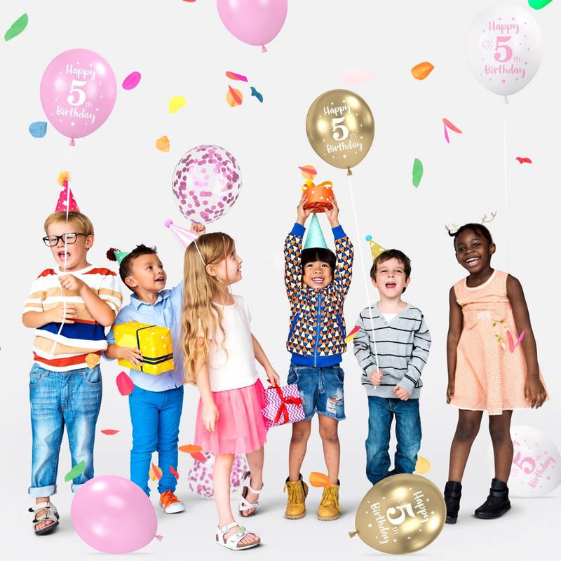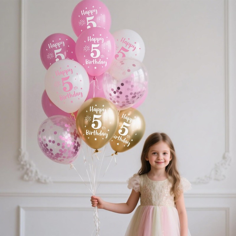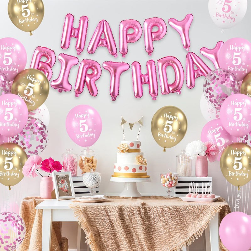 - Happy birthday balloon set: you will receive 22 x latex balloons printed with "Happy 5th Birthday" (pink x 8, white x 8, metallic gold x 6), 6 x pink sequin latex balloons, 2 x unprinted pink latex balloons, 1 x roll ribbon.