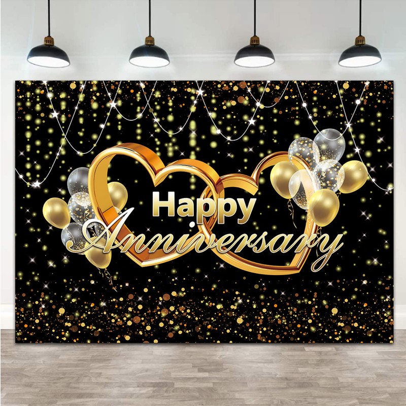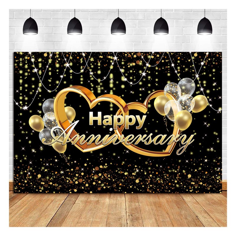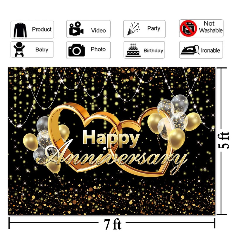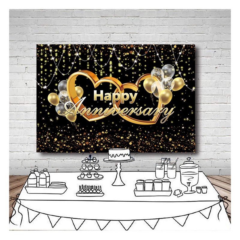 Happy Anniversary Backdrop Black and Gold Balloons Photography Background Poster for Wedding Anniversary Party Birthday Party Decorations Banner 7x5ft