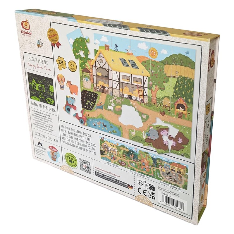- HAPPY BARN FARM STORY PUZZLE: The glow-in-the-dark, story puzzle depicts a happy day on the farm! Includes 2 mini puzzles along with 2 wooden play figures. Combine with other Story Puzzles to expand Bababoo's world!