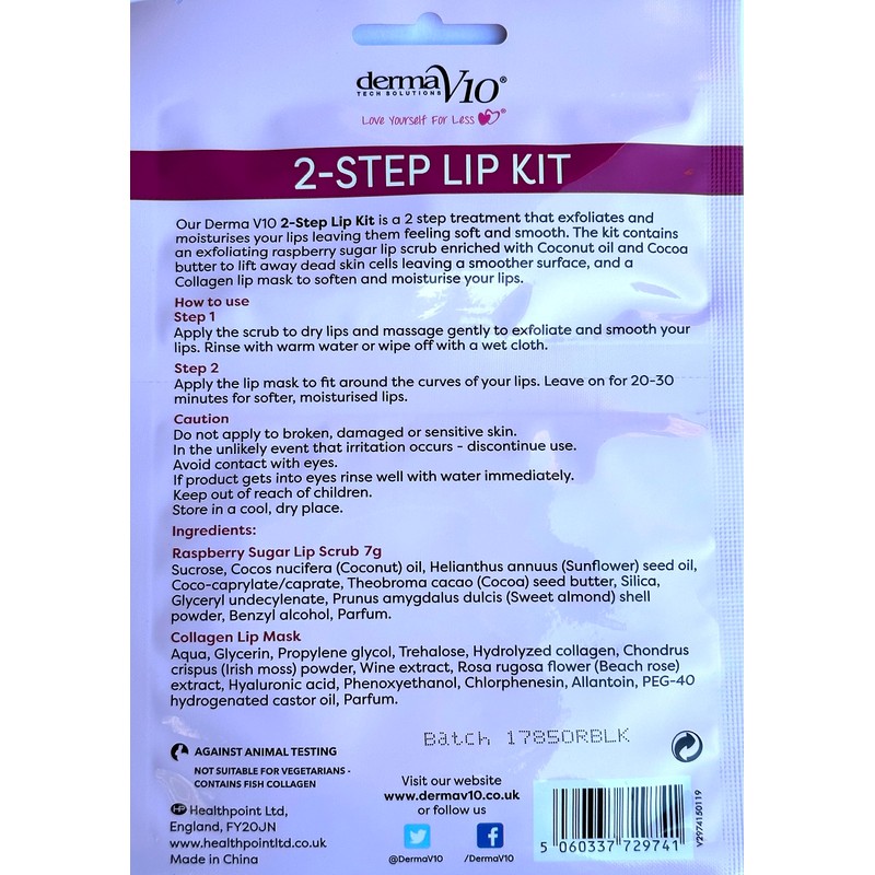 Our Derma V10 2-Step Lip Kit is a 2 step treatment that exfoliates and moisturises your lips leaving them feeling soft and smooth.