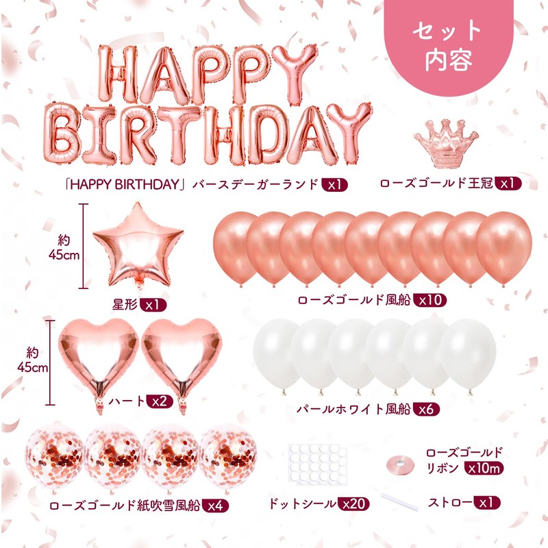 - ♥Decoration Set Contents: 1. Happy Birthday Aluminum Balloon x 1. 2. Crown Balloon x 1. 3. Rose Gold Balloon x 10. 4. White Balloon x 6. 5. Confetti Balloon x 4. 6. Heart Aluminum Balloon x 2. 7. Star Shape Aluminum Balloon x 1. 8. Rose Gold Ribbon x 10 m x 9 dot stickers x 2 pieces