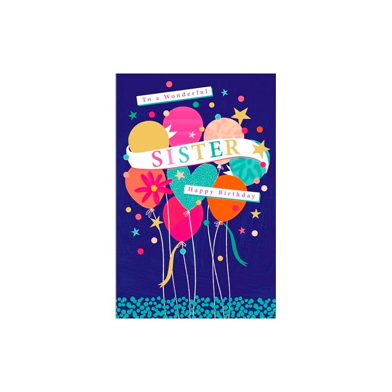 - SIMPLE ELEGANT BIRTHDAY CARD FOR SISTER: A Beautiful Card with Flowers and Balloons design with gold foil patterns for Sister. Message on the Front "To a Wonderful Sister Happy Birthday" Message inside the Card "Have a Super Day!" This card comes with coordinating envelope.