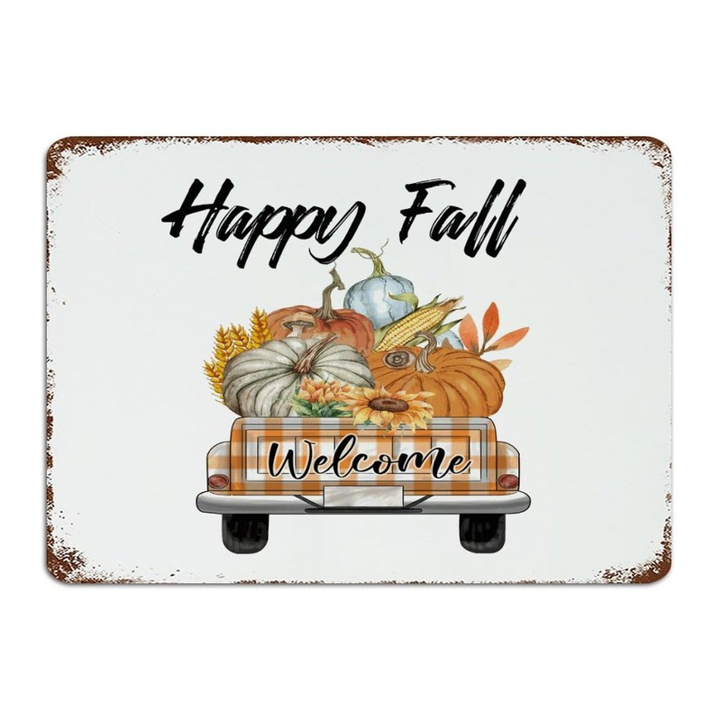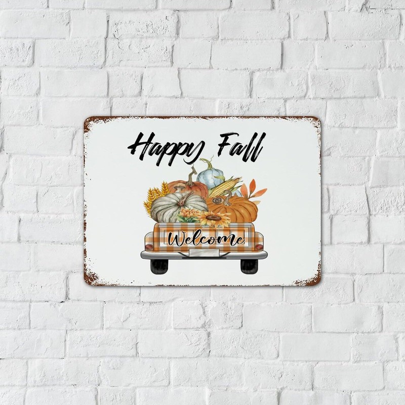 Happy Fall Funny Novelty Metal Signs Outdoor Country House Signs Christian Maple Leaves Pumpkin Man Cave Decor Metal Plaque for Coffee Bar Gate Indoor 10x14 Inch