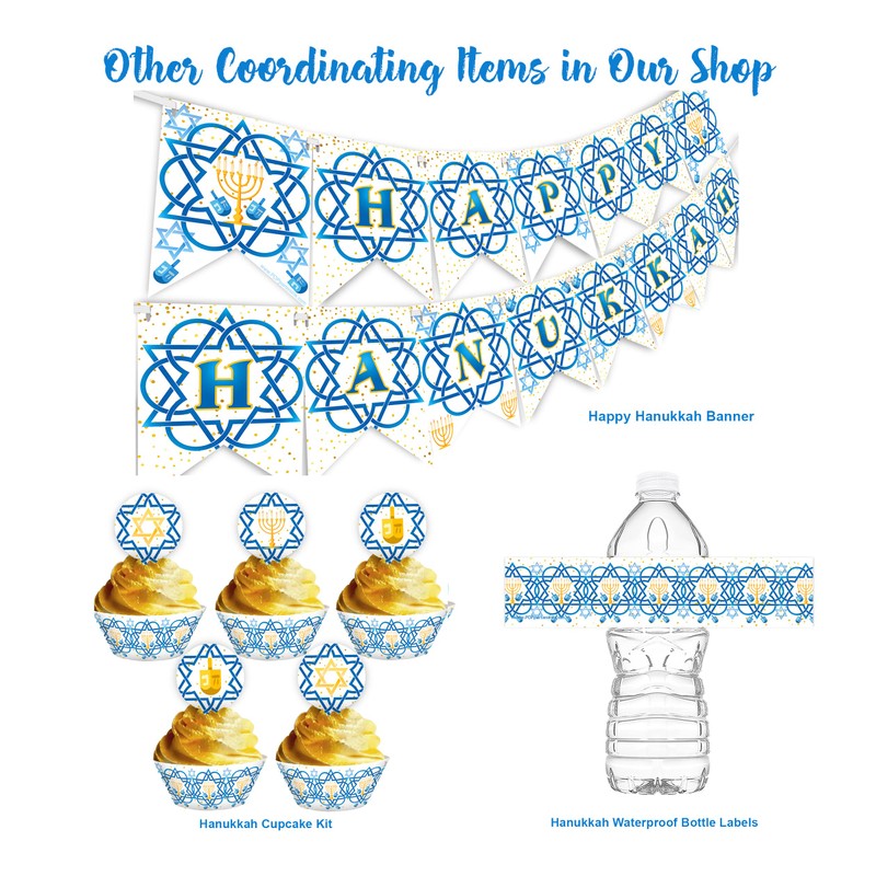 - 15 paper pennant flags which spell Happy Hanukkah as well as 2 end pieces featuring dreidels, menorahs, and beautiful stars