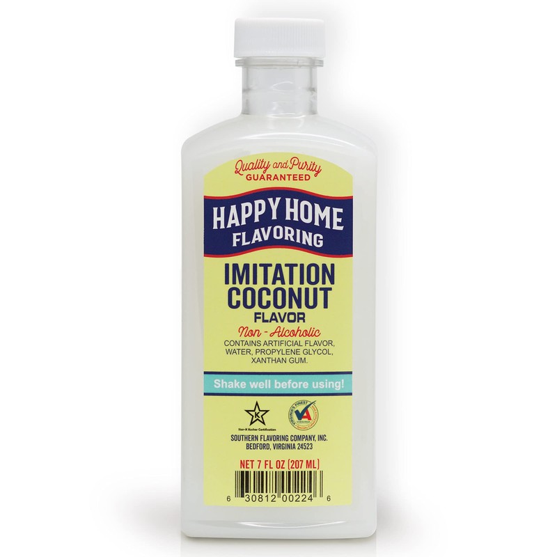 - Happy Home Imitation Coconut Flavoring: Add a tropical flavor to your recipes with Happy Homes non-alcoholic Imitation Coconut Flavor in 7 oz bottle; This clear flavor adds a delicious coconut taste without tinting your icing or cake
