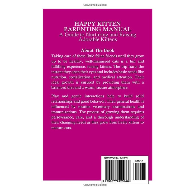 HAPPY KITTEN PARENTING MANUAL:A Guide to Nurturing and raising your adorable kittensTaking care of these little feline friends until they grow up to be healthy, well-mannered cats is a fun and fulfilling experience: raising kittens. The trip starts the instant they open their eyes and includes basic needs like nutrition, socialization, and medical attention. Their ideal growth is ensured by providing them with a balanced diet and a warm, secure atmosphere.Play and gentle interactions help to build solid relationships and good behavior. Their general health is influenced by routine veterinary examinations and immunizations. The process of growing them requires perseverance, care, and a thorough understanding of their changing needs as they grow from lively kittens to mature cats.This fantastic book will examine all of these and much more! Simply scroll up and click the 'Buy Now' button to receive your copy now! You'll be glad you did later!