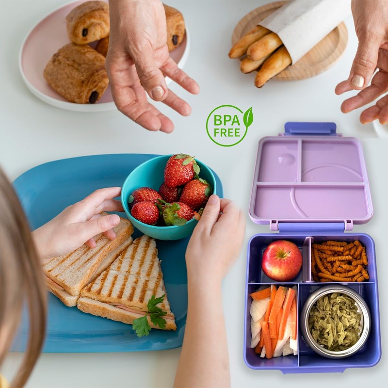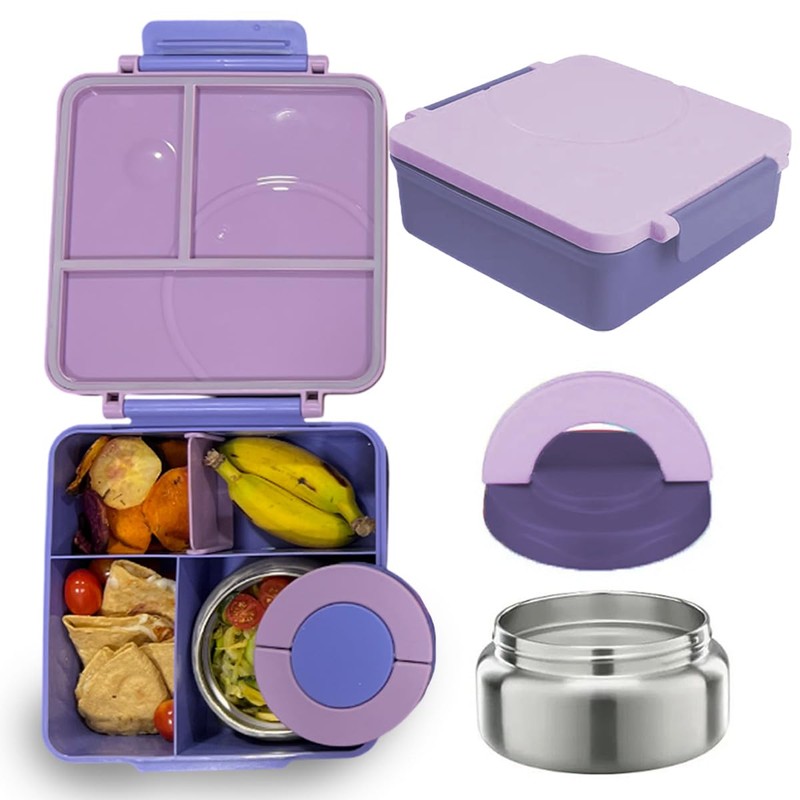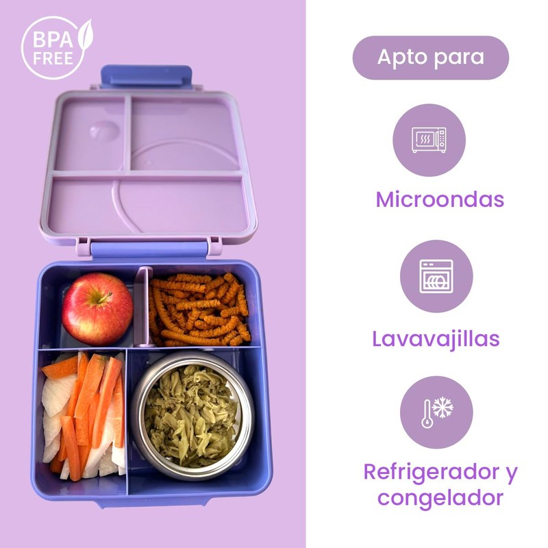 HAPPY LIFE Lonchera niña y niño tipo omiebox incluye termo, bento box c 4 compartimentos modulables de gran capacidad, lunch box con sellado hermético anti-fugas, caja de almuerzo BPA Free (Morado)