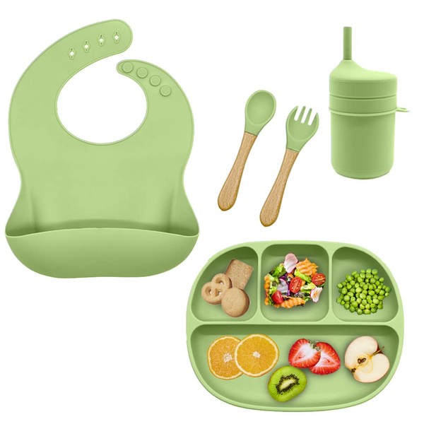 HAPPY LIFE Set de comida para bebe de silicona alimenticio LIBRE de BPA 5pz incluye babero para bebe plato con 4 compartimentos cubiertos vaso entrenador con tapa apto para microondas (Olive)