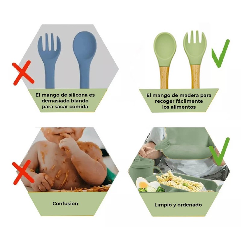 - 🍼 ¡MATERIAL DE CALIDAD! Cuida el bienestar de tu bebe, con el set de comida hecho con silicona grado alimenticio, libre de BPA, inodoro, saludable, NO toxico y duradero Los bordes redondeados de los cubiertos y vajilla son ideales para evitar accidentes y fácil de usar por tu bebe