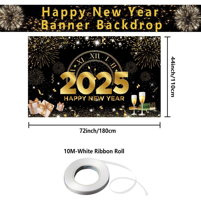 2025 Happy New Year Banner - Black, 73 x 43 Inch White Ribbon Roll - 9mm x 6mm This Happy New Year Banner 2025 is easy to hang and cannot wash off from rain or breeze as it is made with great quality.
