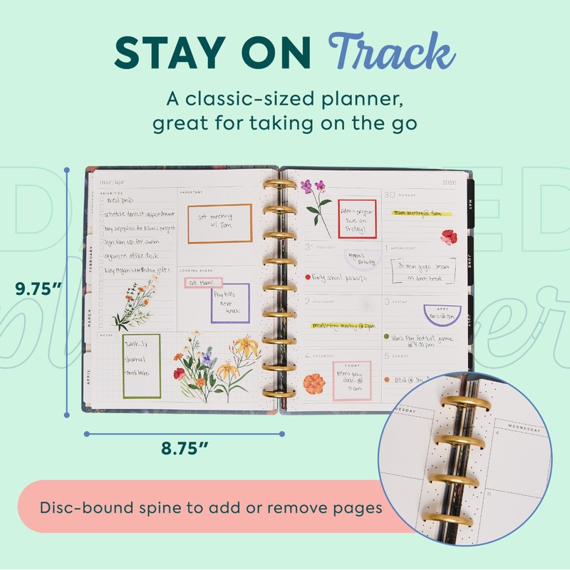 Happy Planner Disc-Bound Planner Jan.–Dec. 2026, Includes 3 Extra Months and 2 Sticker Sheets, Classic Size, 7" x 9.25", Dashboard Layout, Grounded Magic