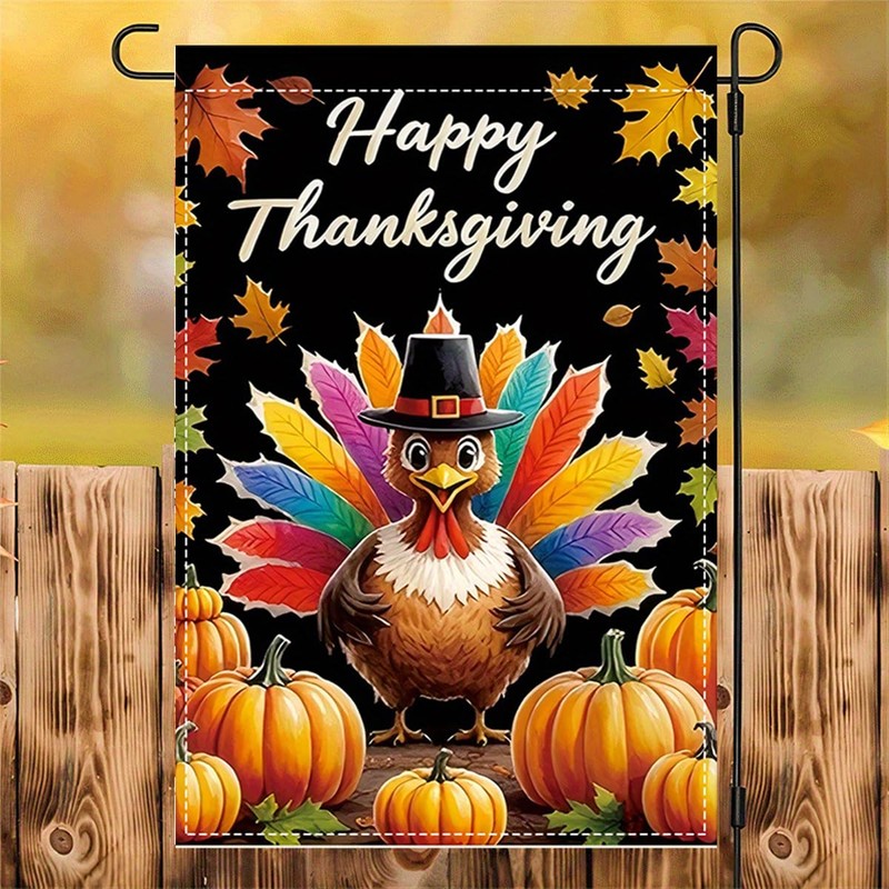 - PACKAGE INCLUDED: ONLY 1PC 12 x 18 inch thanksgiving turkey Garden Flag (Not include flag stand or pole). Please allow +/-1 cm tolerance as it is hand sewn and measured. FEATURES: Sleeve hanger fits standard Banner/Flagpole or Stand.