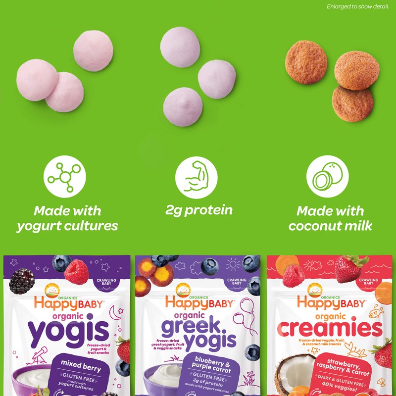 - Sweet Yogi: Little drops of goodness Made with wholesome yogurt and organic fruit, Happy Baby Yogis are melt-in-your-mouth, freeze-dried yogurt drops that provide babies and toddlers with a delicious baby or toddler snack that you can feel good about!