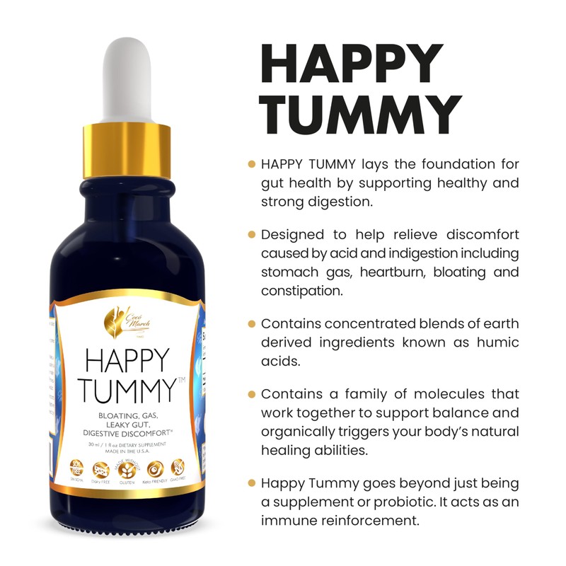 Happy Tummy soothes digestive discomfort from acid, gas, and bloating while supporting gut health. With humic acids for cell communication and microbiome balance, it enhances natural healing. Safe for all ages and pets, it's vegan, non-GMO, and free from gluten, dairy, soy, and preservatives. No refrigeration needed, but can be stored cold if preferred.