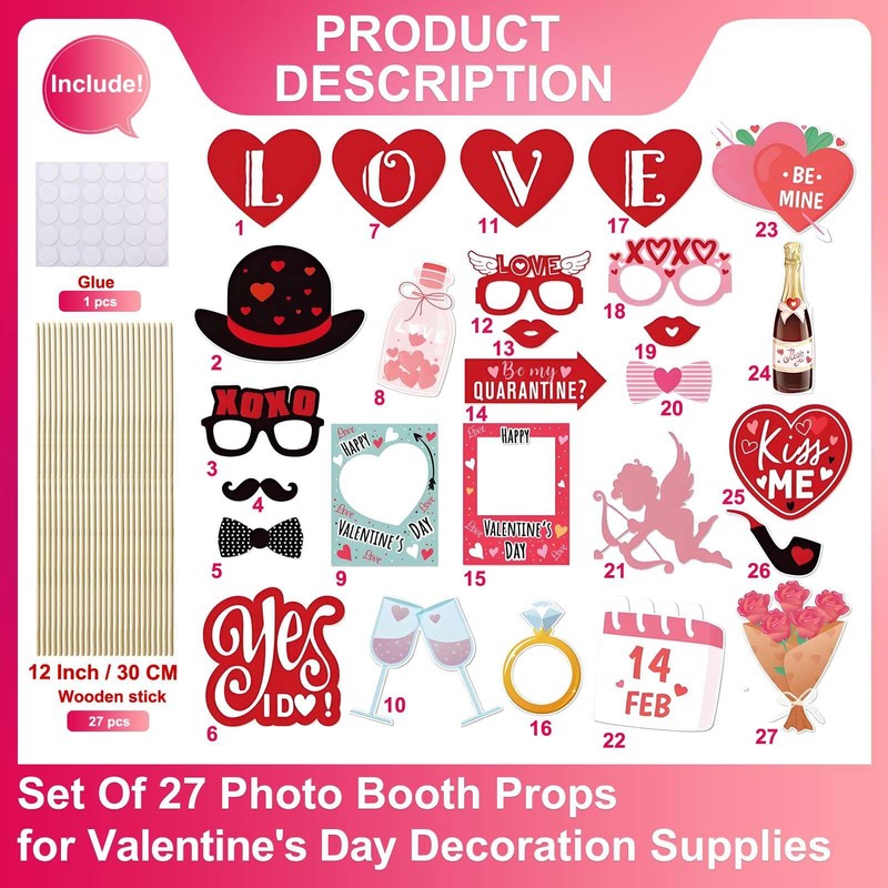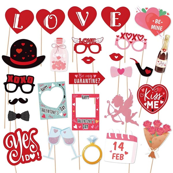 - 【PACKAGING】Each set included 27 pcs happy valentine's day photo props Color: red and pink 27 different and funny patterns, Such as LOVE letters,XOXO,Tie, Crown, Lipstick, Nail Polish, Lips, and many other Valentine party supplies. Embrace Valentines day photo props. Experience joy with Valentines photo props.