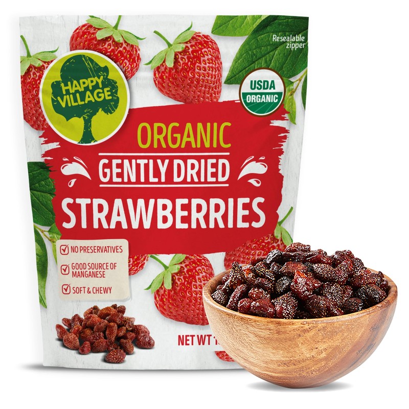 - Organic soft dried strawberries: Includes 18 oz resealable bag of Happy Village Organic gently dried strawberries. No refined sugar, no preservatives.
