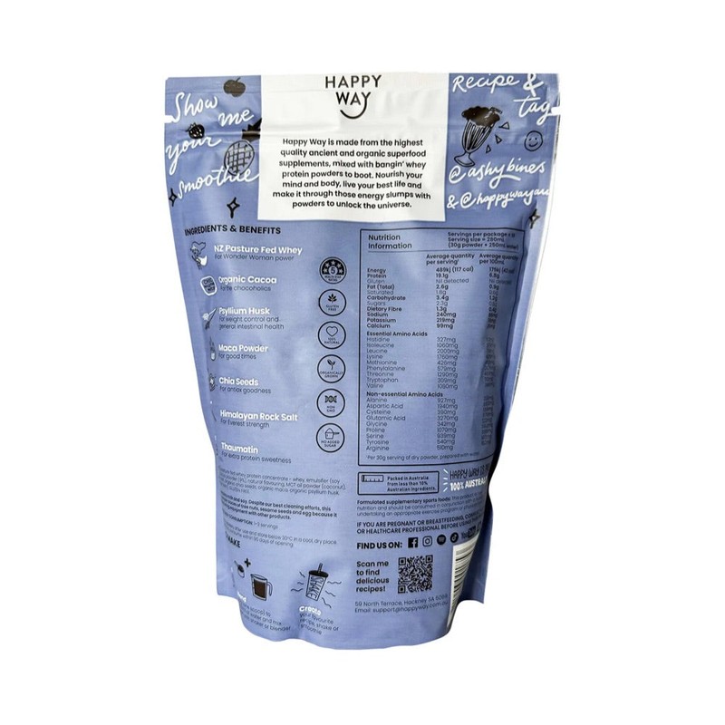 Partnering with Happy Way brand ambassador Ashy Bines, we’ve created a protein powder that tastes as good as a choc coconut bar, minus the guilt! Introducing Ashy Bines Choc Coconut Protein Powder—oozing with chocolatey goodness from organic cocoa and cacao, plus a splash of tropical coconut.