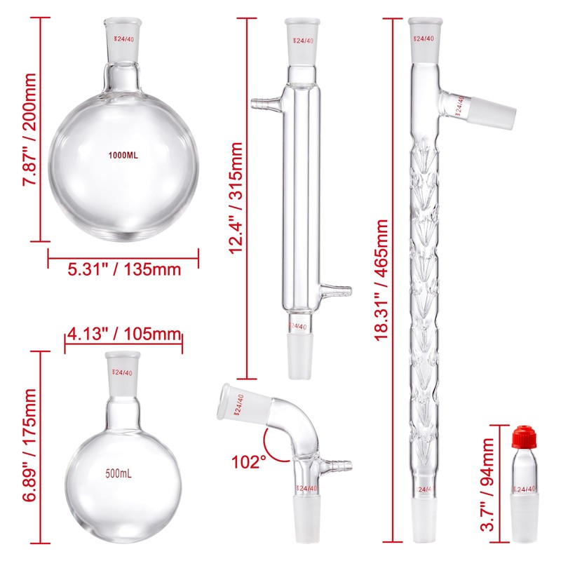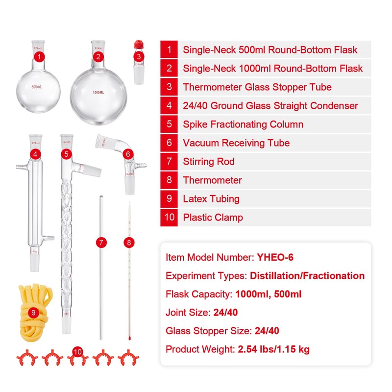 "Flask Capacity: 1000ml, 500ml Product Weight: 1.15 kg / 2.54 lbs Joint Size: 24/40 Glass Stopper Size: 24/40 Item Model Number: YHEO-6 Experiment Types: Distillation/Fractionation"