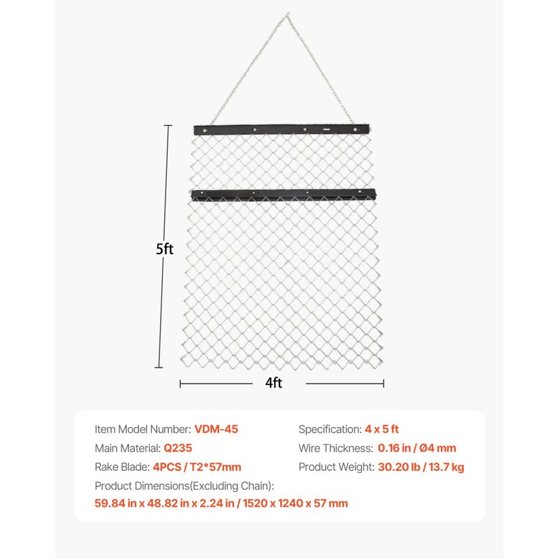 Main Material: Q235 Product Dimensions(Excluding Chain): 59.84 in x 48.82 in x 2.24 in / 1520 x 1240 x 57 mm Product Weight: 30.20 lb / 13.7 kg Item Model Number: VDM - 45 Specification: 4 x 5 ft Wire Thickness: 0.16 in / Ø4 mm Rake Blade: 4PCS / T2*57mm