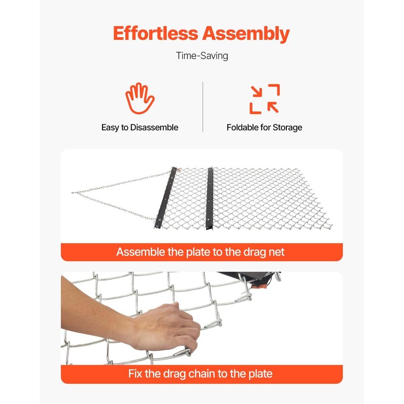 • Efficient Land Leveling: The drag harrow effortlessly breaks up clumps and smooths uneven surfaces, delivering a remarkable leveling effect for your land.