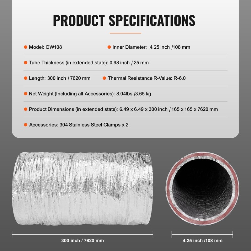 - Durable Construction: Made from a combination of thick aluminum foil material, high-strength spiral steel wire, and fiberglass insulation; This ensures reduced heat loss and enhanced thermal efficiency;