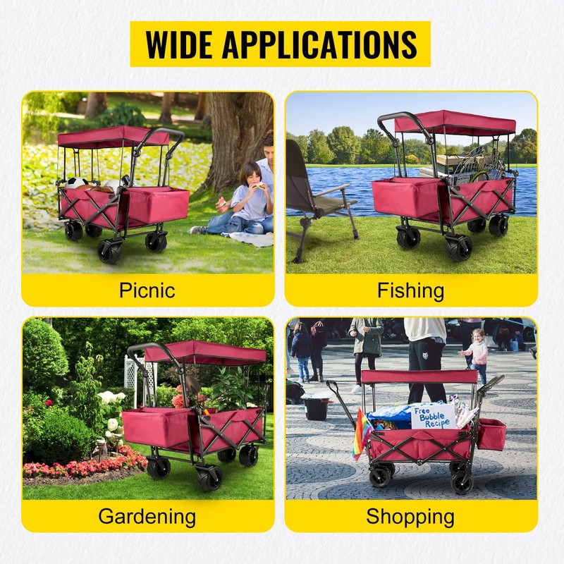 - Premium Steel Frame: Our collapsible wagon has a high-strength steel frame with removable 600D oxford PE fabric, which means it can load anything you want for an outdoor picnic. Moreover, the detachable awning can put away your worries about the weather.