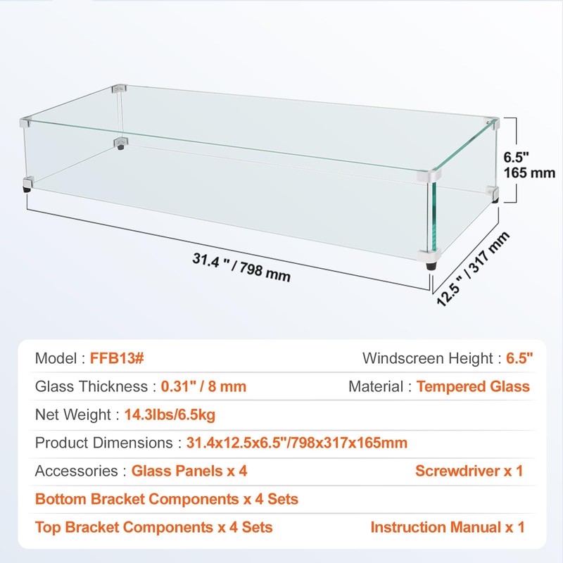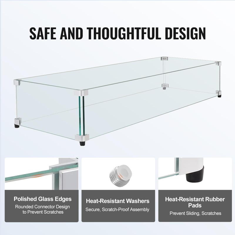 Happybuy Glass Wind Guard for Rectangular Fire Pit Table 31 x 12.5 x 6.5 Inch. 0.31 inch Thick, Easy to Assemble, Sturdy Tempered Glass. with Hard Aluminum Corner Bracket & Rubber Feet
