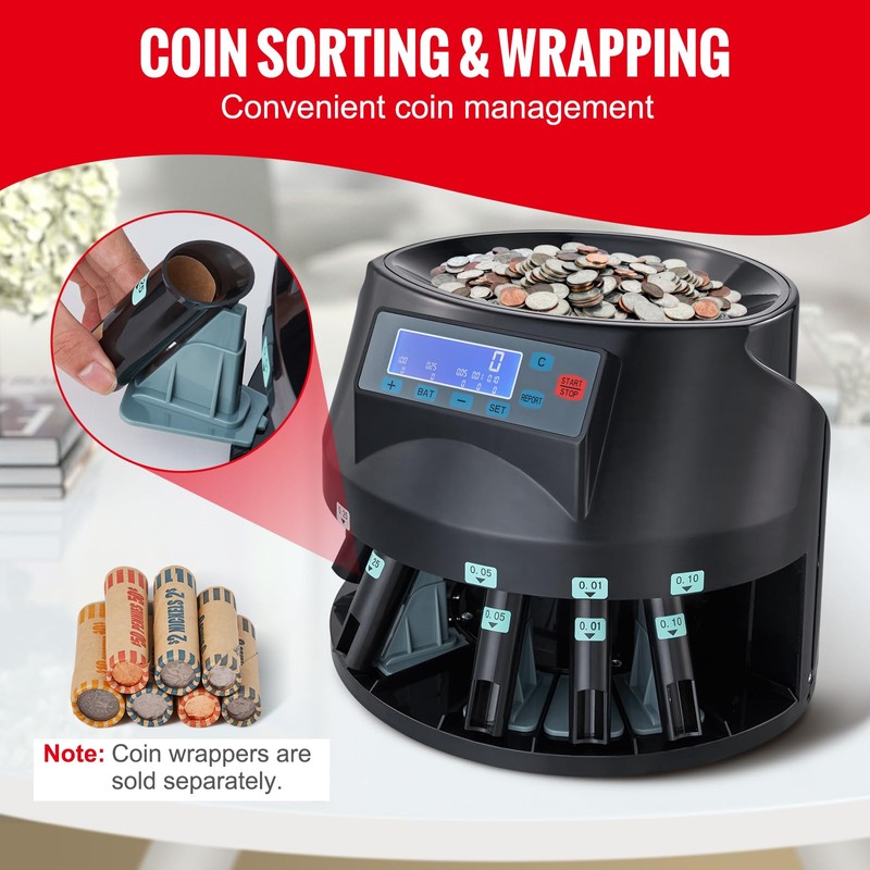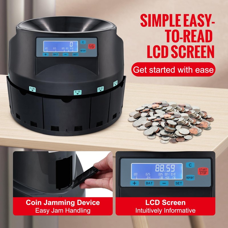 - USER-FRIENDLY OPERATION: The change counter features an LCD display and simple control buttons for easy operation. Track your progress in real-time, simplifying coin counting and management tasks for enhanced productivity.