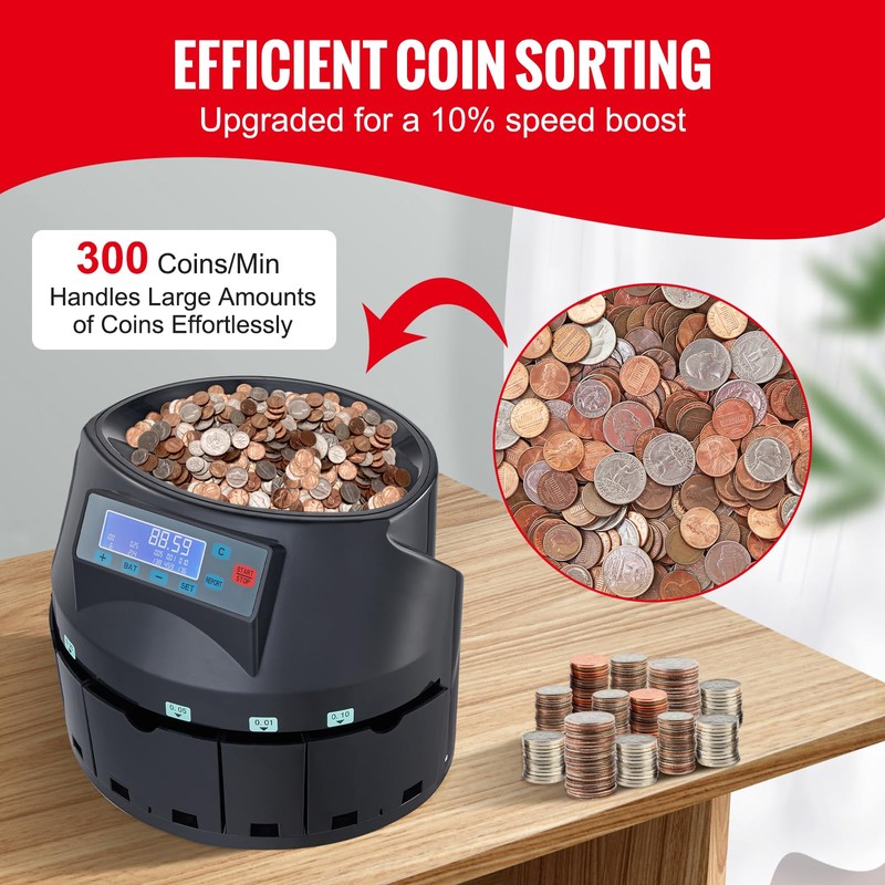 - EFFICIENT COIN SORTING: The upgraded sorting technology allows the coin sorter to process coins at a rate of 300 coins per minute. It sorts Pennies, Nickels, Dimes, Quarters, and Dollar coins, making coin counting faster and more efficient.