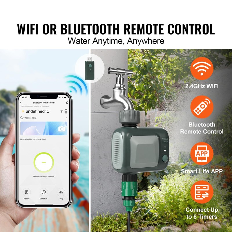 - Versatile Remote Management: Happybuy's smart WiFi water timer offers you effortless control. Link up via 2.4 GHz WiFi or Bluetooth within 15 meters to the Smart Life app. Whether you're at home or on a trip, you can conveniently adjust your garden's watering timetable, ensuring your plants get proper hydration.