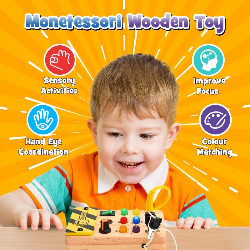 - Montessori toy: improves attention span through interactive experiences that improve hand-eye coordination, colour recognition and fine motor skills. The activity board is a great toy for early education of children aged 1 2 3 4 years.