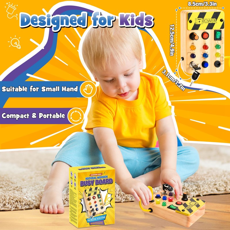 - Elaborate design: this Busy board has 6 switches with different levels of difficulty, each corresponding to a different coloured LED light, and the lights have a medium brightness. For toddlers who like to play with electric switches, parents can be sure that their children will be entertained for hours!