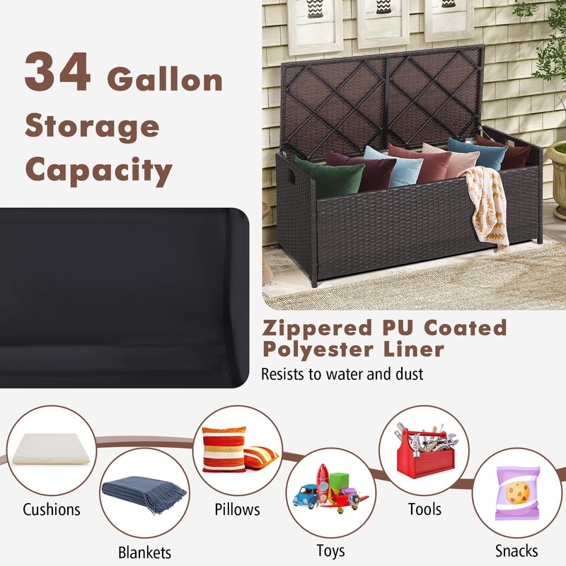 HAPPYGRILL 34 Gallon Patio Storage Bench Deck Box, 3-in-1 Rattan Wicker Storage Box with Seat Cushion & Zippered Protective Liner, Effort-Saving Gas Strut