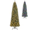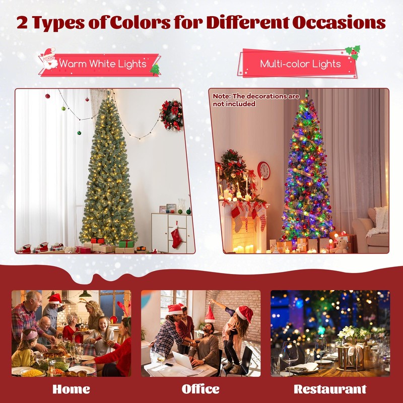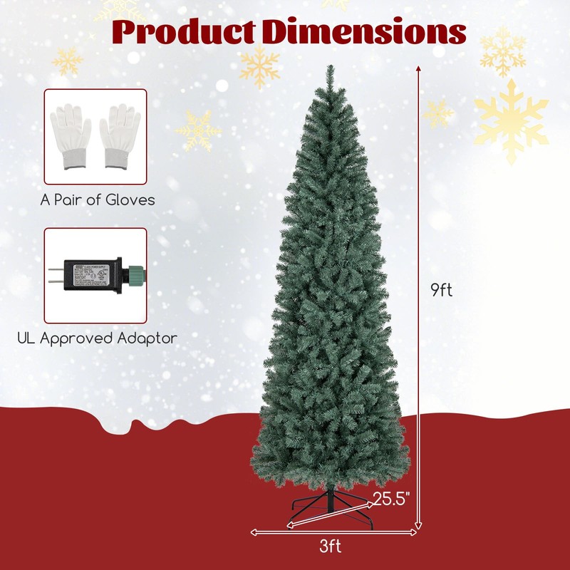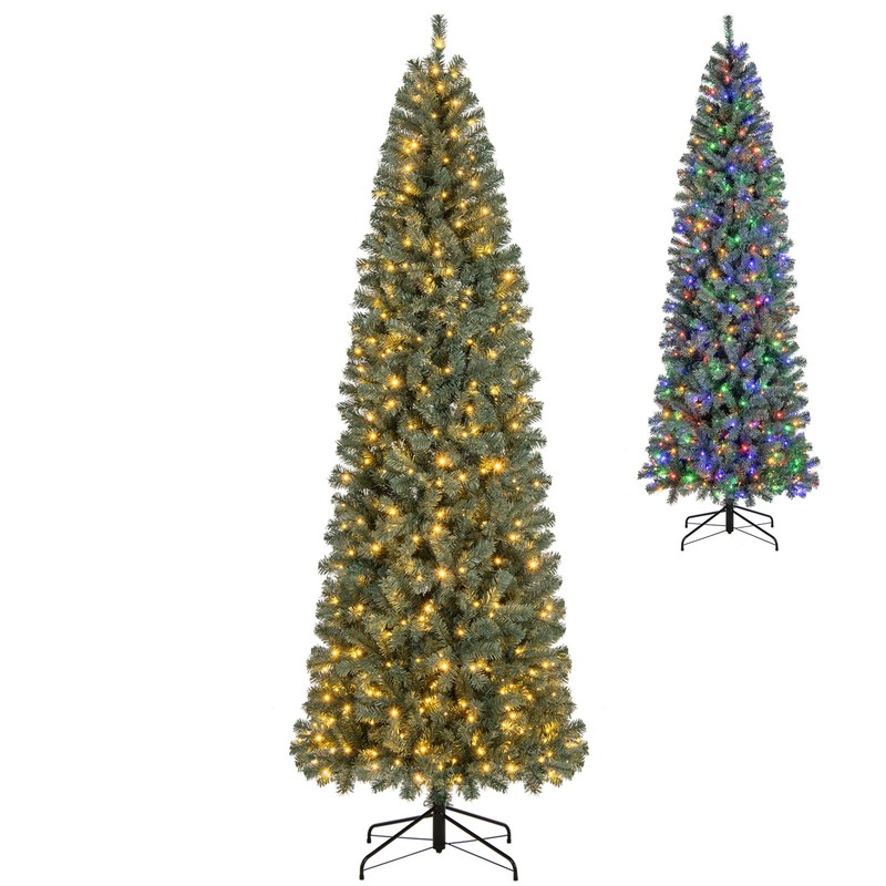 HAPPYGRILL 9 FT Pre-lit Pencil Christmas Tree, Hinged Artificial Xmas Tree w/ 1168 Blue Branch Tips, 500 Warm White & Multi-Color LED Lights, 9 Lighting Modes