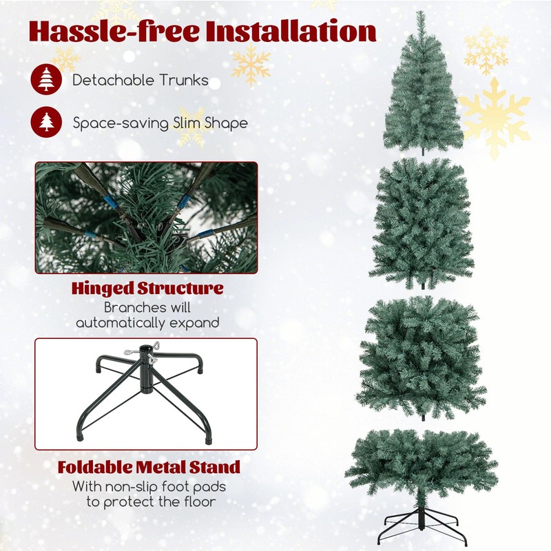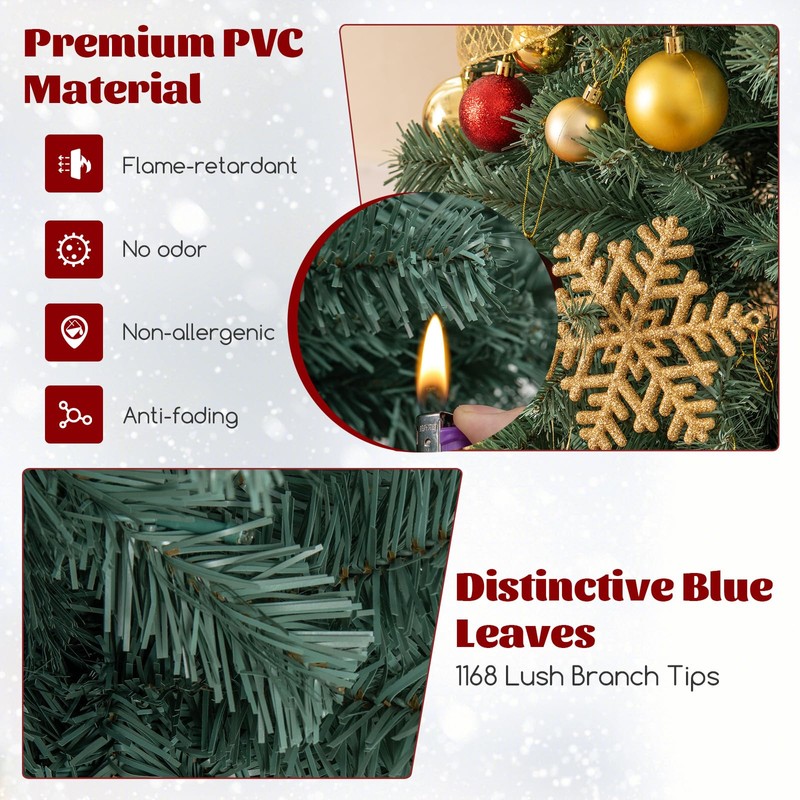 - Stunning Appearance: The artificial Christmas tree features 1168 lush branch tips, creating a dense appearance. What sets the slim Xmas tree apart is the unique blue leaves that exude sophistication and style, making it a standout centerpiece in any room.