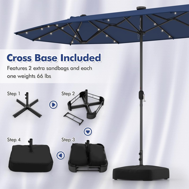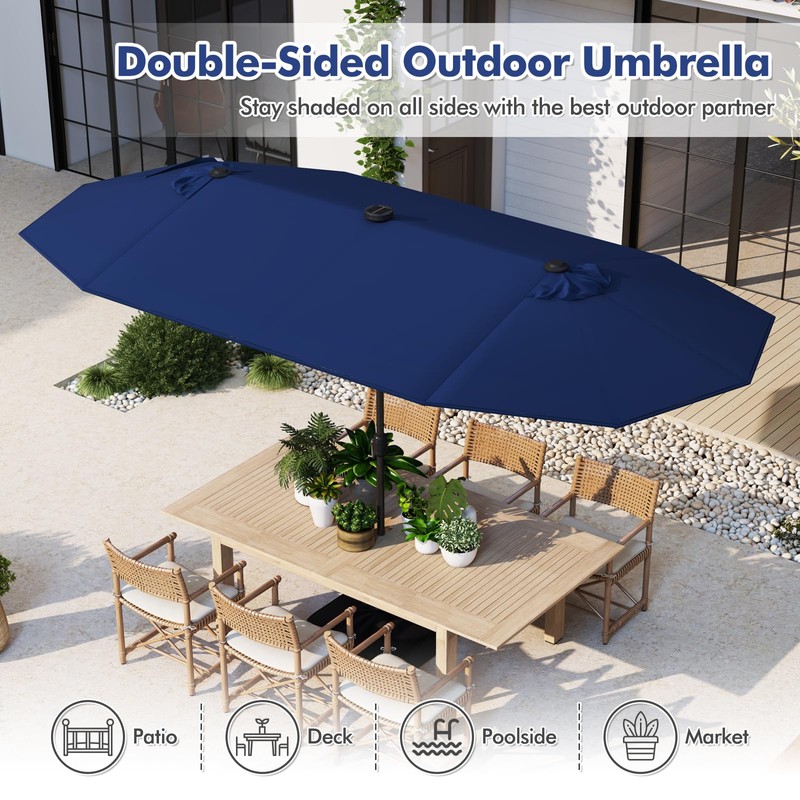HAPPYGRILL Double-Sided Patio Umbrella with Solar Lights, 13FT Large Umbrella with Crank Handle, Umbrella Base Included, Market Twin Table Umbrella for Outdoor Backyard Garden Poolside (Navy)