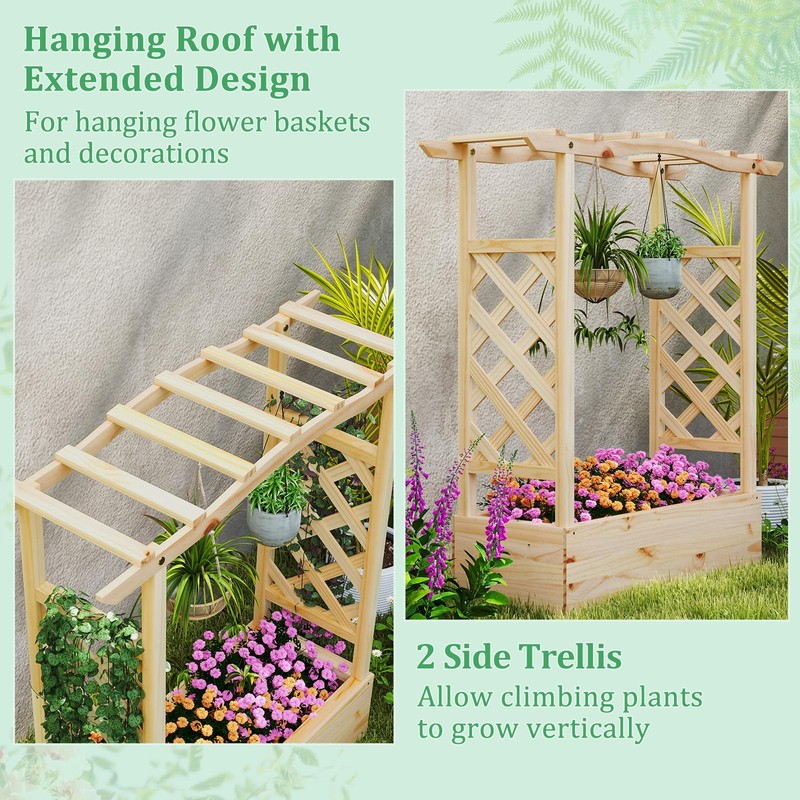 HAPPYGRILL Raised Garden Bed with Trellis, Freestanding Wood Planter Box w/Hanging Roof, Drainage System, Elevated Wood Garden Box for Vine Climbing Plants, Outdoor Planter w/Trellis for Patio Balcony