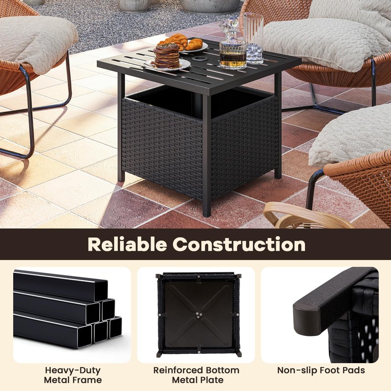 - Reliable Construction: Engineered with a robust metal frame, the outdoor side table provides exceptional stability and strength. The reinforced bottom metal plate further enhances support, offering a reliable base for your umbrella and table essentials.