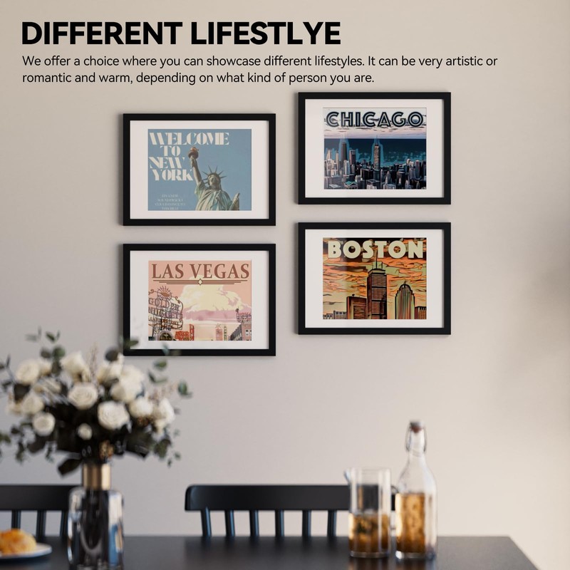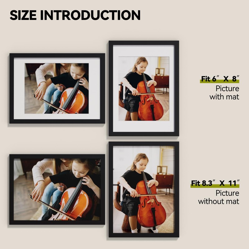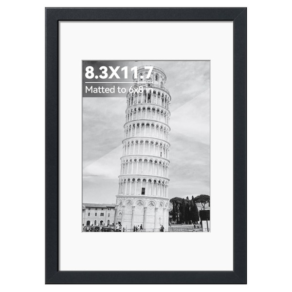 - Diverse Displays: Fits 8.3x11.7 photos without mat or use with included custom mat for 6x8 display. You can hang 8.3x11.7 black picture frame horizontally or vertically for a wall mount.