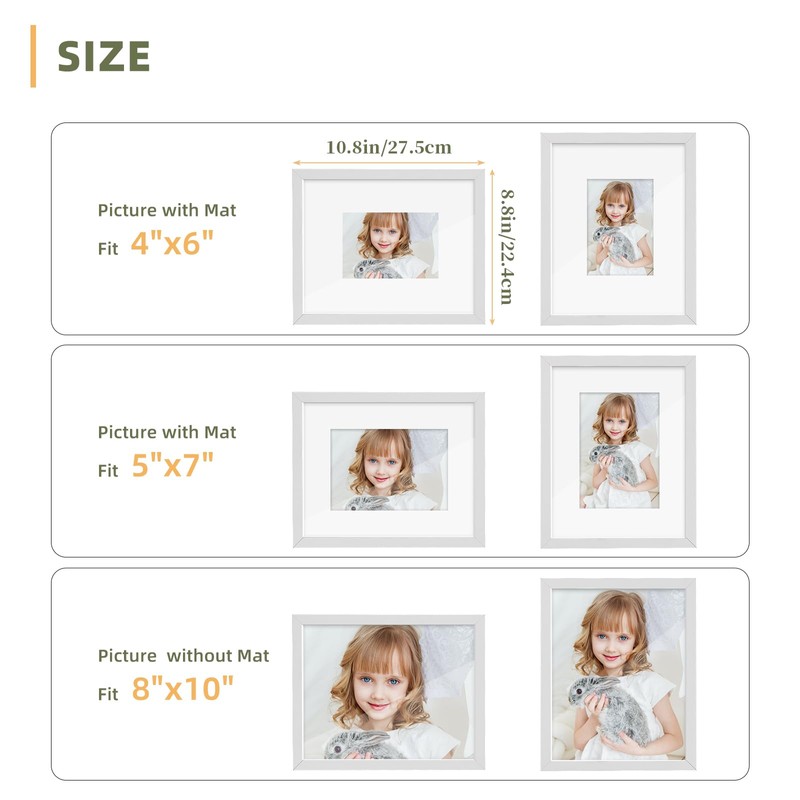 - Unique Design - The 8x10 picture frame white can display 4x6 and 5x7 photo with Mat or 8x10 photo Without Mat, which can layer your photo and enhances its appeal. With hooks and brackets, the frames can be displayed on desktop or on the wall, vertically or horizontally. Just put them wherever you want.
