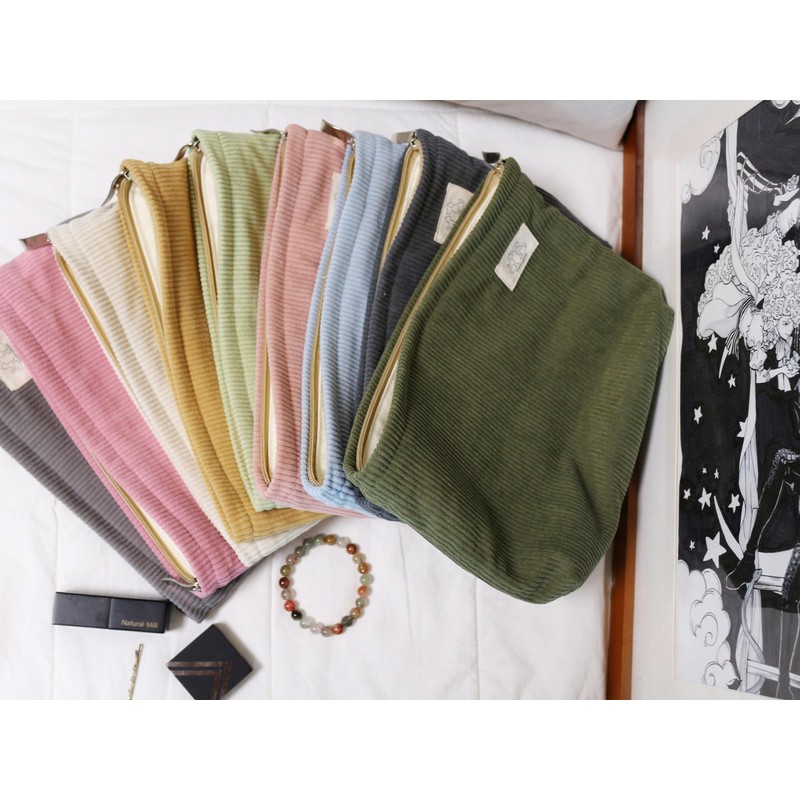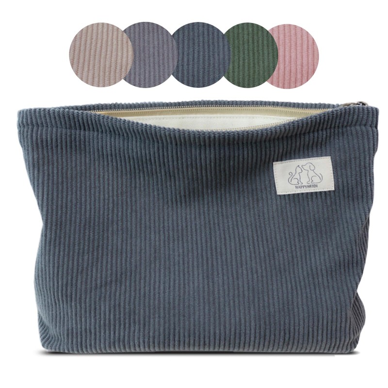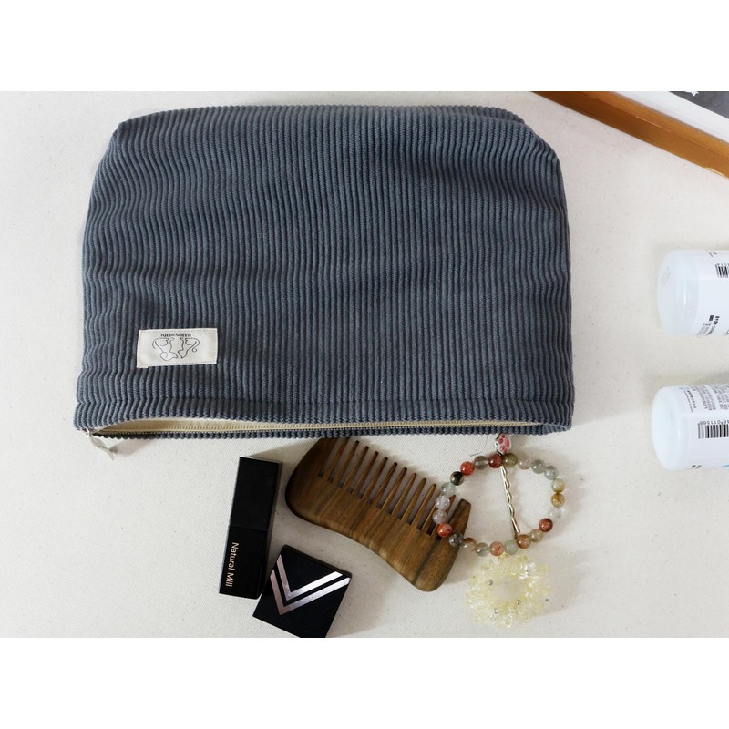 HAPPYHEIDI Dark Gray Corduroy Makeup Bag Cosmetic Toiletry Travel Pouch, Make Up Accessory Purse Organizer, Canvas Lined