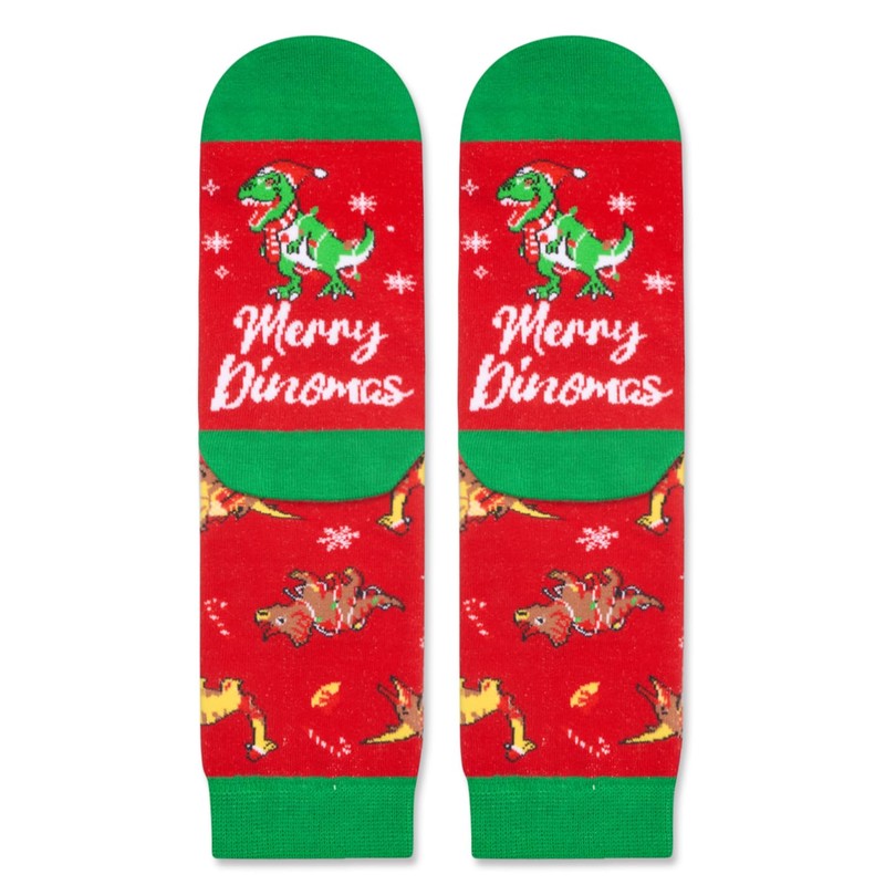 - RED DINOSAUR SOCKS: Step into the Jurassic holiday season with our vibrant red socks, each showcasing bold prehistoric patterns. Unearth the playful secret on the sole – "MERRY DINOMAS" – a fun reminder to keep the festive cheer alive amidst the holiday rush