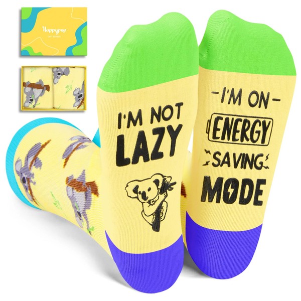 - KOALA SOCKS: Our funny socks are designed for both women and men and feature cute koala and tree branches, with the funny sayings "I'M NOT LAZY I'M ON ENERGY SAVING MODE".