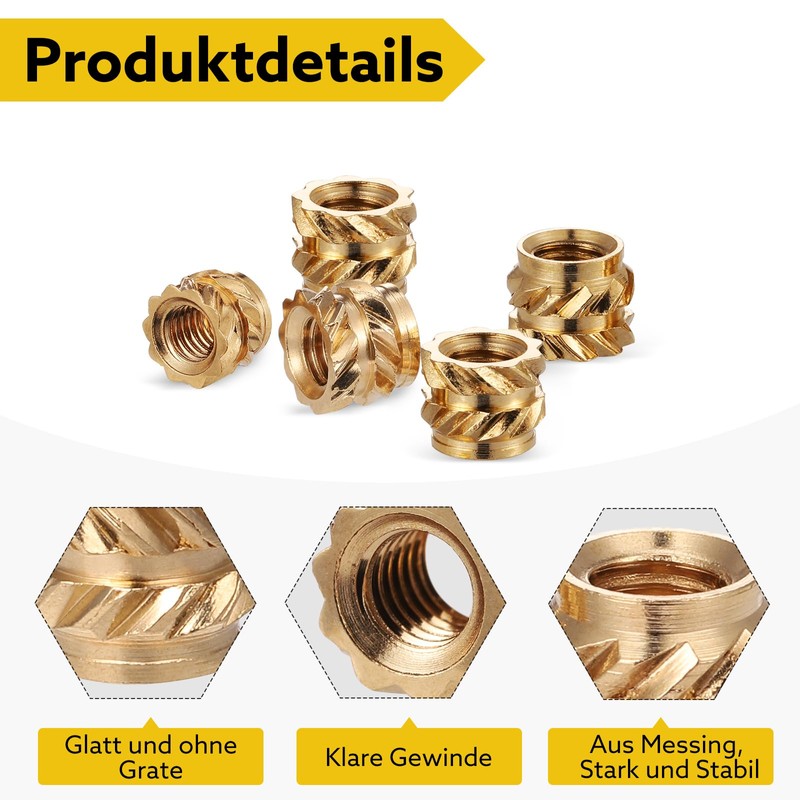 • Stark und stabilDer Gewindeeinsatz besteht aus Messing, das eine gute W?rmeleitf?higkeit aufweist und sich nicht leicht verformen l?sst. Die Oberfl?che ist glatt und gratfrei und die Gewinde sind klar. Diagonale Gewinde sorgen fr eine gute Passform und erh?hen die Drehmomentfestigkeit.